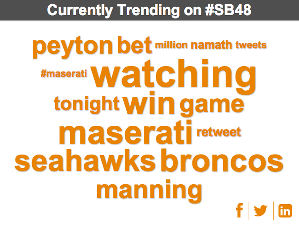 Want to know what's currently trending on #SB48? Follow along with our real time infographic: http://bddy.me/1bitqg9 pic.twitter.com/4cQg9pNrKq