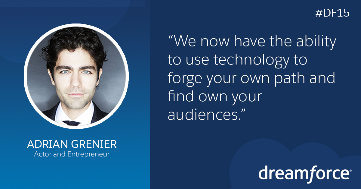 Actor and entrepreneur, @adriangrenier joins #DF15. Now on #SalesforceLIVE http://sforce.co/1QEeqPh pic.twitter.com/MtwxBHzNZH