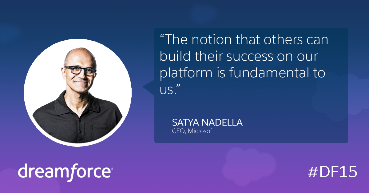 Historical photo at #DF15, Microsoft CEO @satyanadella on stage with @Salesforce screen and iPhone background. Great!pic.twitter.com/ypTAFJLJBB