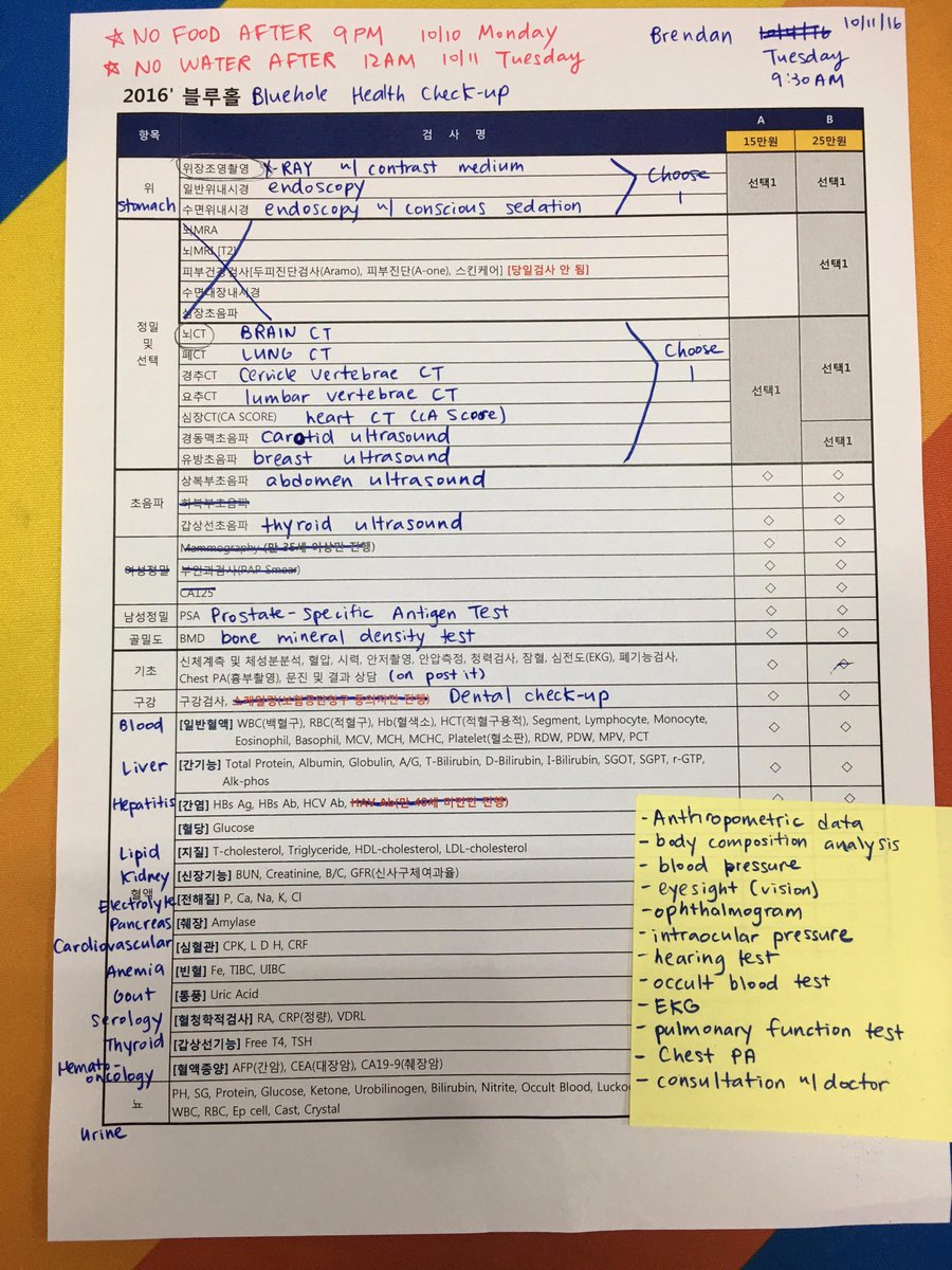 Here in Korea, a yearly health check up is mandated by law. I have mine in a few weeks, and it looks pretty damn thorough!pic.twitter.com/n7VDiFDyYU