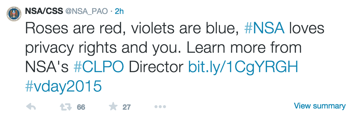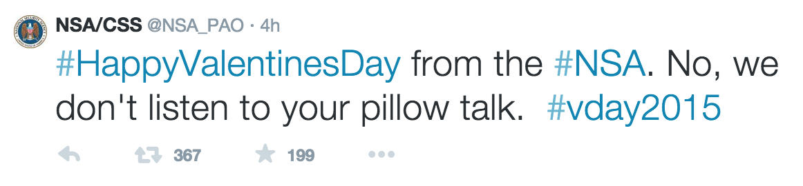 The NSA Public Affairs Office has really jumped the shark today. https://twitter.com/NSA_PAO/status/566659683985801217 …pic.twitter.com/KDACa73u9c
