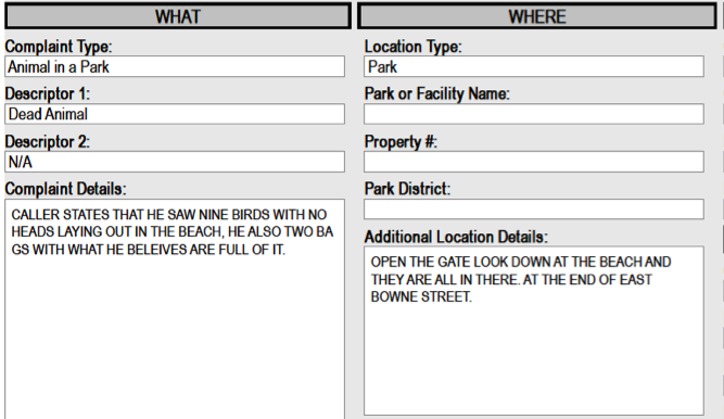 My FOIL request for reports of decapitated animals found in NYC parks came back. It's 64 pages of this!pic.twitter.com/AyLG5Wx9Xt