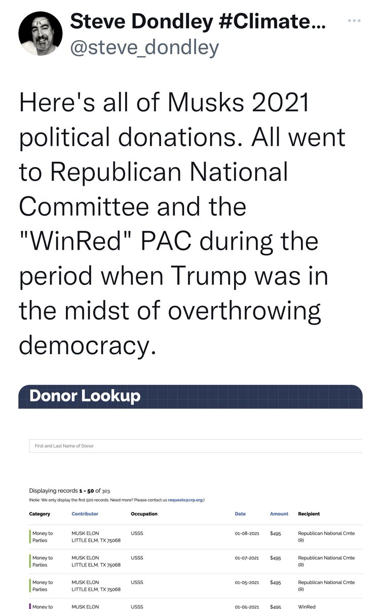 Because “[Dems] have become the party of division & hate,” Elon Musk felt compelled to donate to the RNC the day before and after the Jan 6 insurrection….pic.twitter.com/bGC7jca9CV