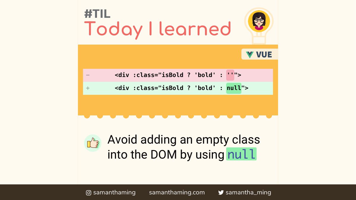 Avoid adding an empty class into the DOM by using “null” in #vuejs#CodeNewbie#100DaysOfCode@vuejsdeveloperspic.twitter.com/U6oXVunqYm