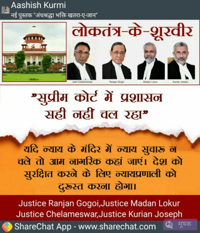 जो सुप्रीमकोर्ट के चारो जजो ने कहा हैं कि कुछ भी ठीक नही चल रहा और लोकतंत्र खतरे में हैं ये सब बाते सन्त रामपाल जी ने 2014 में ही बता दिया था। जिस कारण कुछ भ्रष्ट जजो ने उल्टा उनको ही झूठे केसो में फसाकर जेल में डाल दिया।pic.twitter.com/1RlVd4Q7SQ