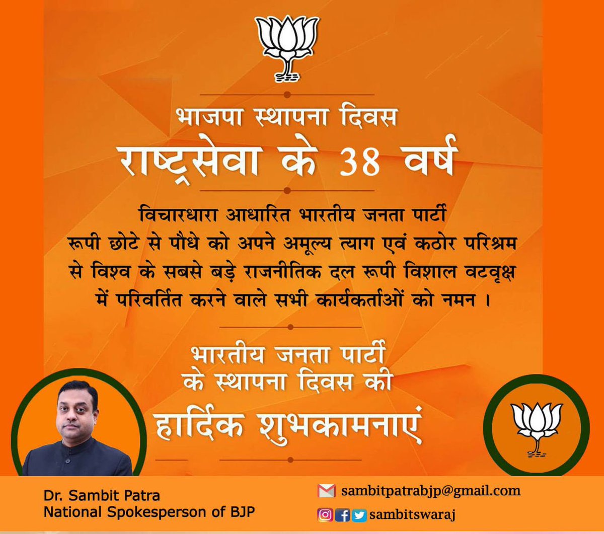 विश्व के सबसे बड़े राजनैतिक दल भाजपा के 38वें स्थापना दिवस पर सभी परिश्रमी, निष्ठावान तथा लगनशील कार्यकर्ताओं को अनेक-अनेक बधाई।
