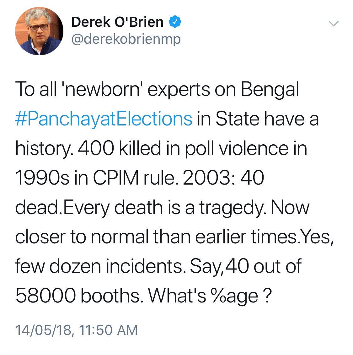 Next time Mamata Banerjee says "somebody is planning to assassinate me" Please tell her, "EVERY DEATH IS A TRAGEDY, THE RATE OF ASSASSINATIONS ARE CLOSER TO NORMAL THAN EARLIER TIMES" Ok?https://twitter.com/sambitswaraj/status/995942594512375808?s=19 …