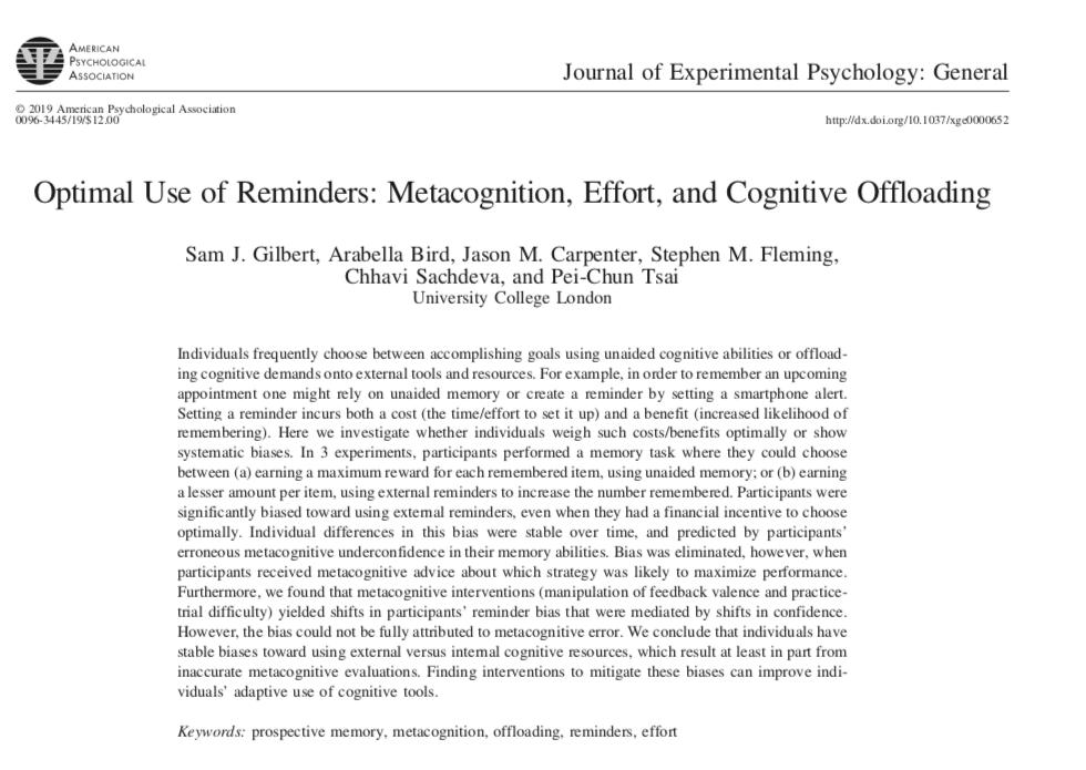 our new paper in JEP:General - "Optimal Use of Reminders: Metacognition, Effort, and Cognitive Offloading" https://psycnet.apa.org/record/2019-50040-001?doi=1 … 1/4pic.twitter.com/WWILTkKGQl