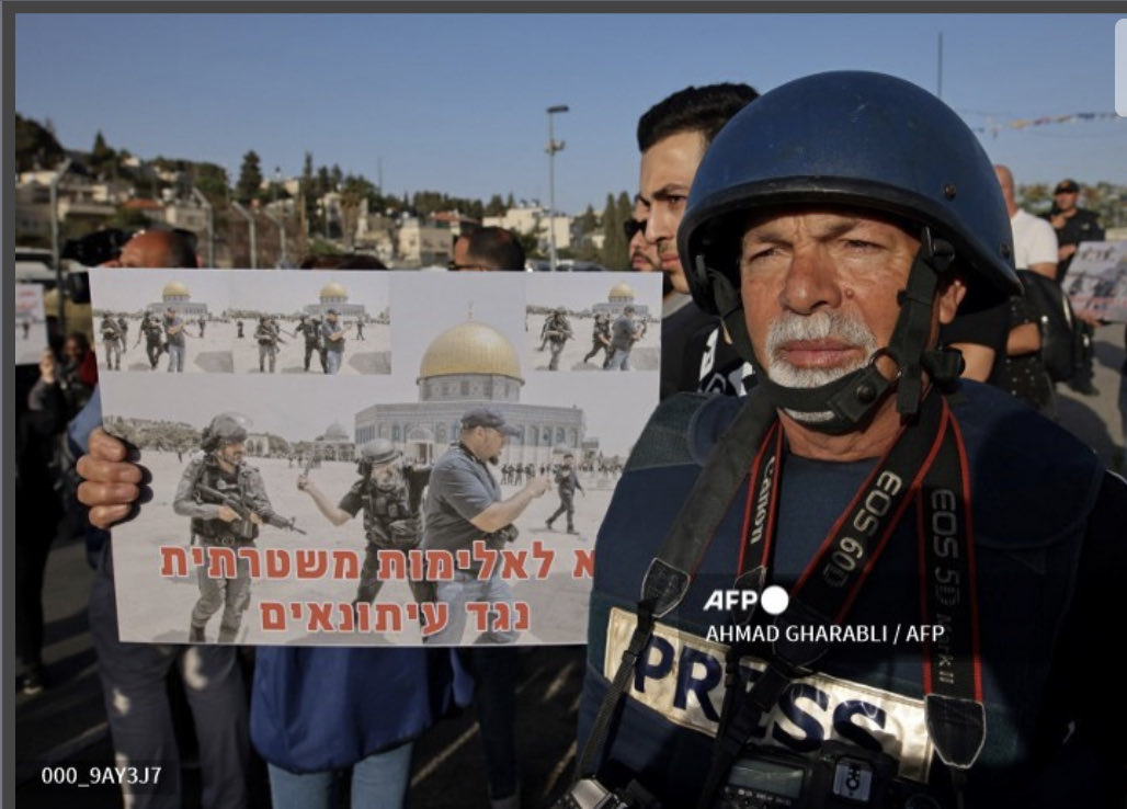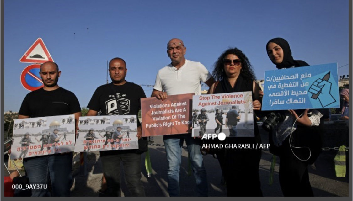 journalists protest against attacks on their colleagues in the annexed east Jerusalem neighbourhood of Sheikh Jarrah, on May 28, 2021. (Photo by AHMAD GHARABLI / AFP)pic.twitter.com/khnxQLslYb