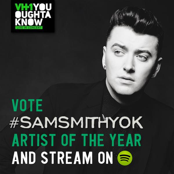 You heard @samsmithworld! Vote for @VH1's #YouOughtaKnow Artist of the Year by streaming the nominees on @Spotify http://spoti.fi/1tdGsD1
