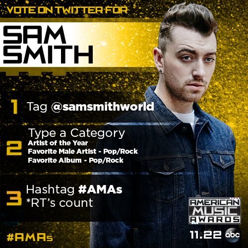 @TheAMAs Sam is nominated 3X at@theAMAs! RT this to vote "@samsmithworld ARTIST OF THE YEAR#AMAs”pic.twitter.com/wPaSbVZZDy