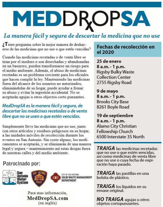This Saturday, Jan. 25th, San Antonio residents are encouraged to dispose of unwanted, expired over-the-counter and prescription medications at the #MedDropSA collection event. Screenshot the flyer below for more information and a list of do's and don'ts!pic.twitter.com/Hdt6kZdKuJ