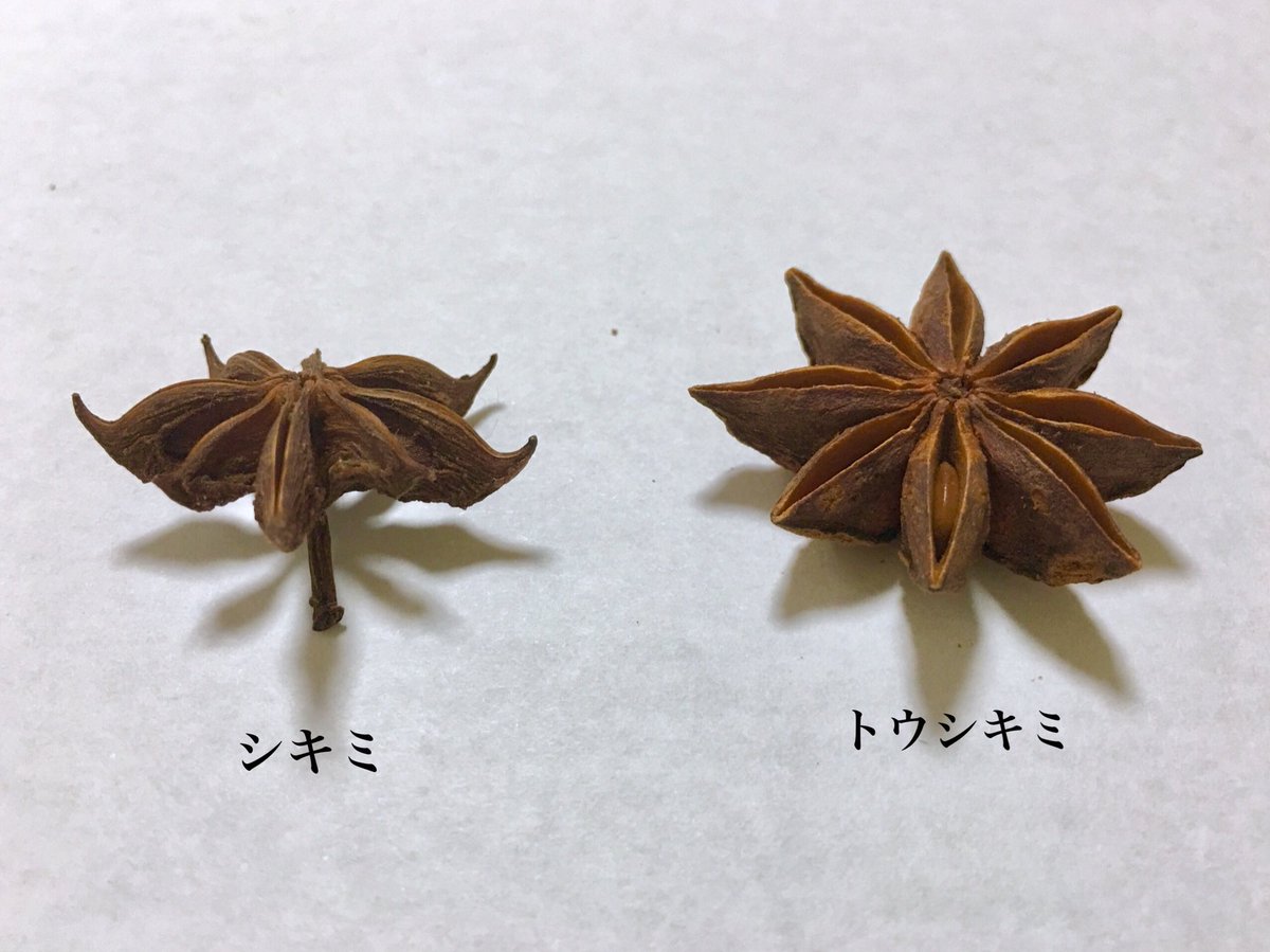 【追記】シキミ(有毒)とトウシキミ(香辛料の八角)の違いです。 確認したかったので八角を買ってきました。八片ある鞘の先端が鉤状になっていたらシキミです。植物では唯一毒物および劇物取り扱い法により劇物に指定されていますが、仏前に供えたりお線香になったり魔除けにしたり花も可憐です。pic.twitter.com/BXWuqL5Nxp