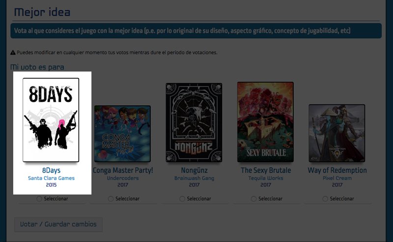@SantaClaraGames#8DAYS sigue dando guerra. Finalista a Mejor Idea en los#PremiosDeVuego2017 http://www.devuego.es/premios2017/?cat=mejoridea#votacion …pic.twitter.com/gix3u5xAHi