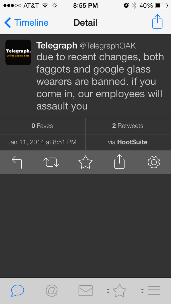 Local business, just lost me forever https://twitter.com/TelegraphOAK/status/422229393130680321 … Bet they’ll claim “hacked”pic.twitter.com/niPi5A9SEt