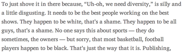 it's fascinating how he ends up deciding to trumpet the whole "if the creators are not x race, they can't write a character of that race"
