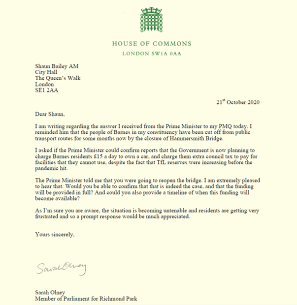 I've been under the impression that the taskforce were managing the repairs to #hammersmithbridge But after hearing that @ShaunBaileyUK is the one that will reopen it, I thought I'd write to him to ask him about funding and timescales. I look forward to his response.pic.twitter.com/fnIwpkEik9