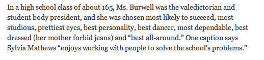 Wow "@sarahkliff: Sylvia Mathews Burwell was apparently super popular in high school. http://www.nytimes.com/2014/06/06/us/health-secretary-sylvia-mathews-burwell-builds-relationships-from-west-virginia-to-washington.html … pic.twitter.com/gDXRyjBm5V”