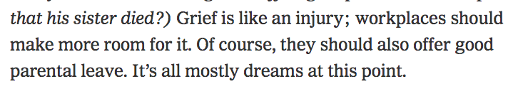 Compassionate and just working conditions for those who are bereaved and mourning shouldn't be a far-away dream, and neither should parental leave, for that matter. https://www.nytimes.com/2020/01/29/business/grieving-in-the-office-advice.html …pic.twitter.com/0z6RmmjHc9