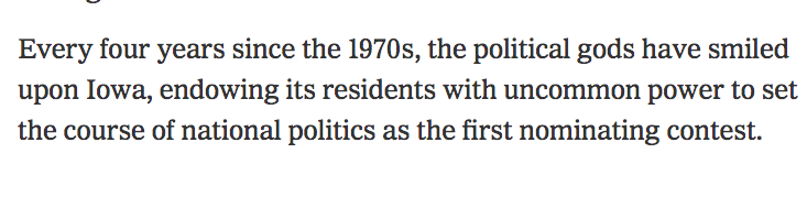 Strange to see Iowa's political stranglehold not only over the US, but over the world, which is profoundly impacted by whoever helms the biggest military empire. The candidates have vastly different records on war and militarism, and this is so much power in the hands of 1 state.
