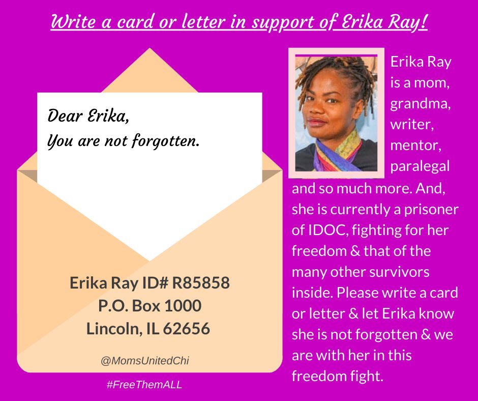 When my sister died, Erika Ray (who was incarcerated with her) wrote a poem in her honor. An excerpt: "If she could say one more thing, she would warn us to never leave anyone behind for leaving anyone behind assures an inevitable step back." Please write to Erika.