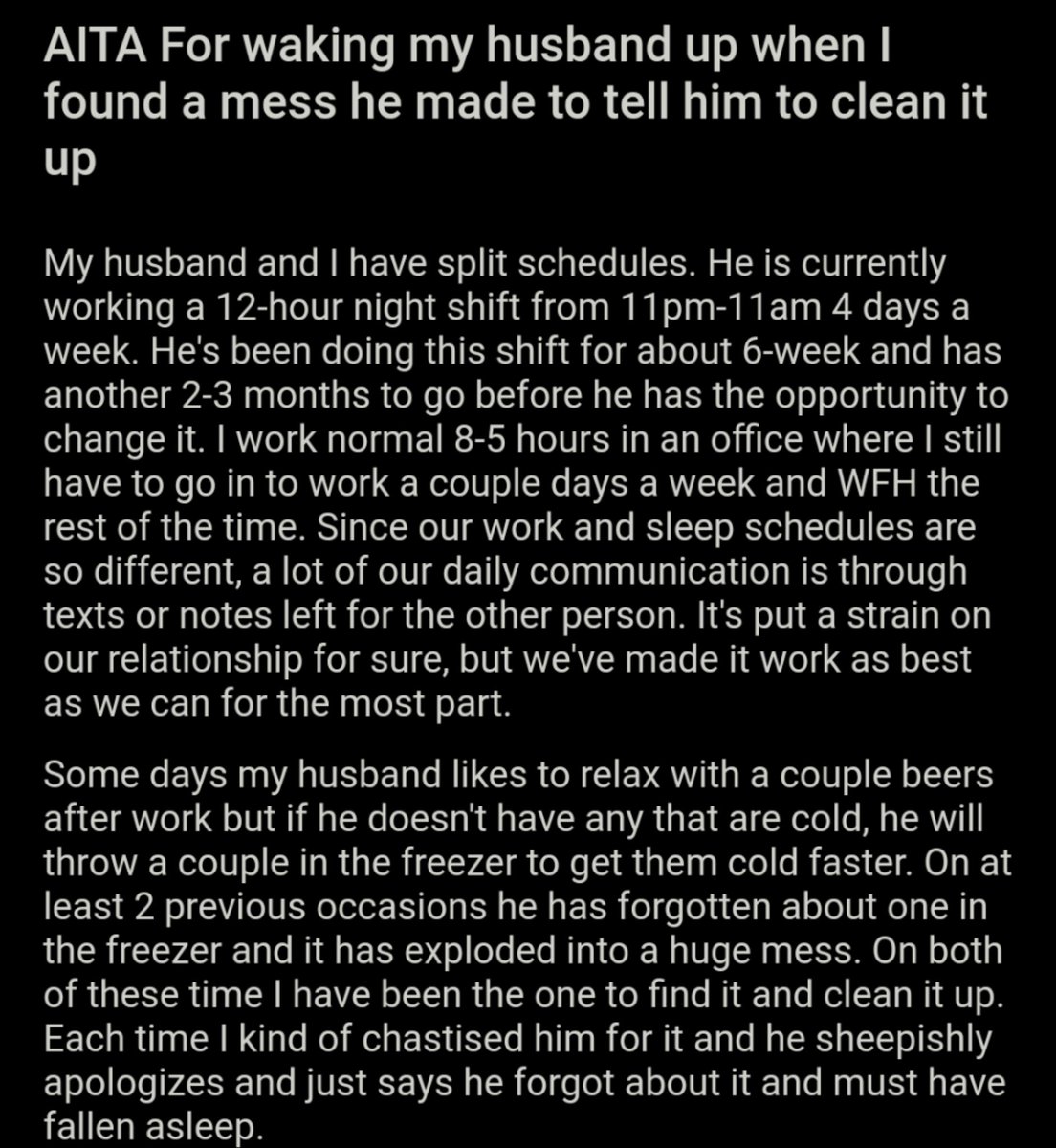 AITA For waking my husband up when I found a mess he made to tell him to clean it up? https://bit.ly/2K0LI3h pic.twitter.com/j0kVNpsPwX