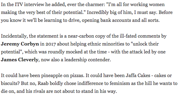fwiw I think Raab's answers on feminism could be good for him, politically - because it shows he doesn't back down, and his constituency won't be that fussed (or agree with him)