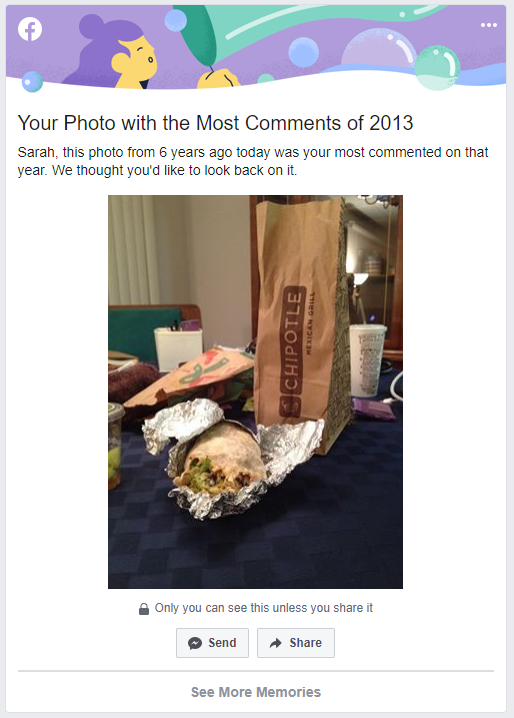 Thank you to Facebook for reminding me of the Chipotle I ate when I first returned home to the US at Christmas that I then got violent food poisoning from after boasting about it onlinepic.twitter.com/H3GLuksiaL