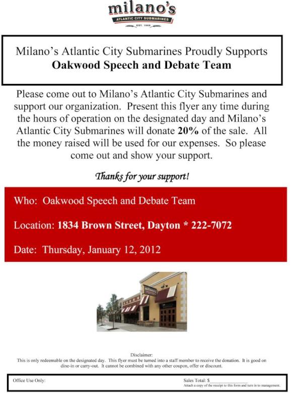 Everyone should go to Milano's tonight to support Speech & Debate! Give them this flyerpic.twitter.com/cFhStfd3