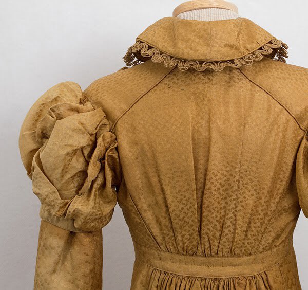 Detail, splendid yellow gold silk damask pelisse, c1815-20. Those sleeves! Via past sale http://VintageTextile.com For detailed description & images: https://www.vintagetextile.com/new_page_251.htm …pic.twitter.com/z5GVTAXXIl