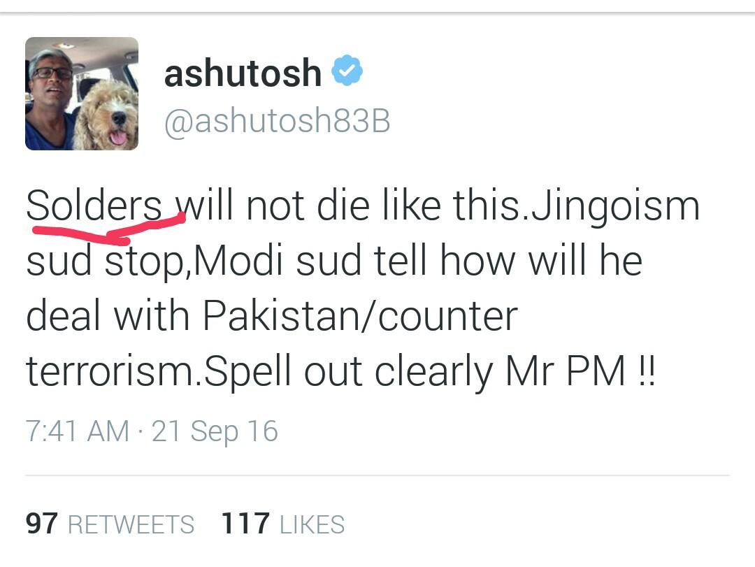 In first line he wrote Soldiers as Solders. In last line he wants Modi to spell out clearly. Irony died somewhere in Oxford dictionarypic.twitter.com/2xFchUAwp3