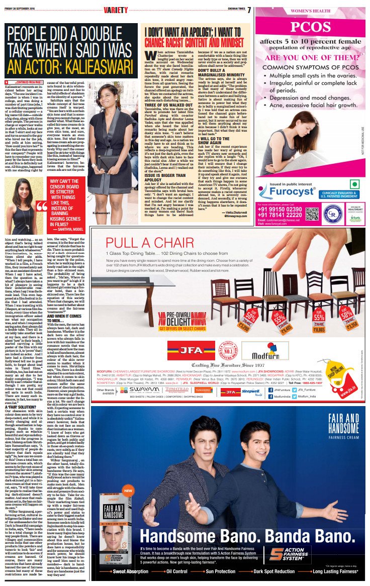 Chennai Times. Pg.1: Tannishtha Chatterjee-skin color debate. Pg.7: Story continues (almost half page). Ends with Fair & Handsome ad.pic.twitter.com/ED3YmjMUqQ