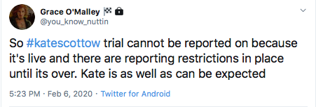 Stephanie Hayden / Kate Scottow trial update: Nothing can be reported on until tomorrowpic.twitter.com/YKWUlLSRkP