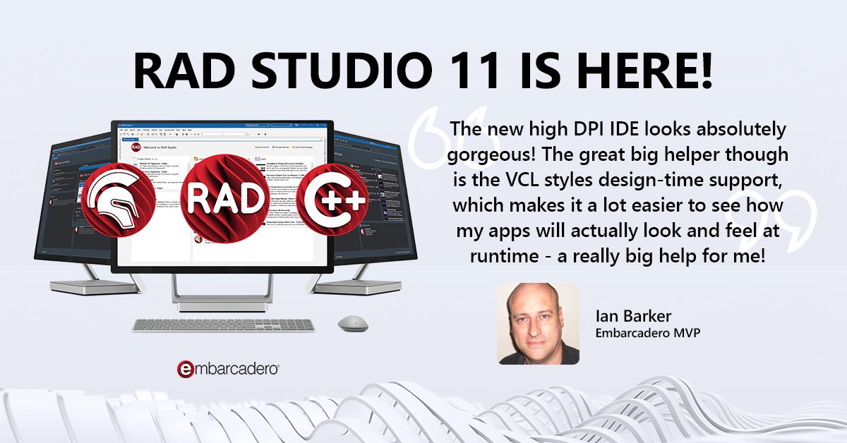 #RADStudio11isHere "The new high DPI IDE looks absolutely gorgeous!" Ian Barker, Embarcadero MVP@punctuation See What’s New in#RADStudio11: http://embt.co/whatsnew-in-RADStudio11 …pic.twitter.com/7QzPmKsK0a
