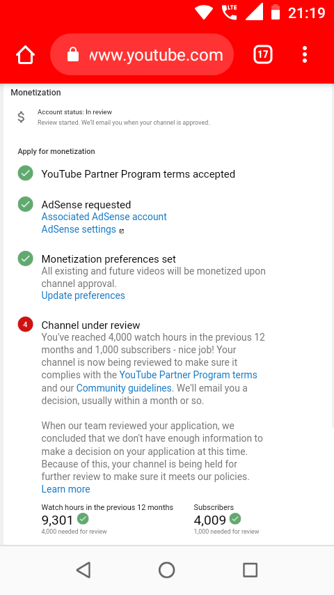 @TeamYouTube Hi YouTube Team,I have completed 1000 subscribe and 4000 hours watch time, but still my channel under review last - 2month/8day,s ,I have 4000 subscriber right now.please do something as soon as possible, please check it out... Thanks..pic.twitter.com/1fORheoAJH
