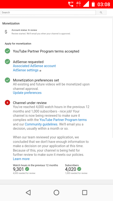 @TeamYouTube Hi YouTube Team,I have completed 1000 subscribe and 4000 hours watch time, but still my channel under review last - 2month/9day,s ,I have 4020 subscriber right now.please do something as soon as possible, please check it out... Thanks.pic.twitter.com/T8Vj5kvSkC