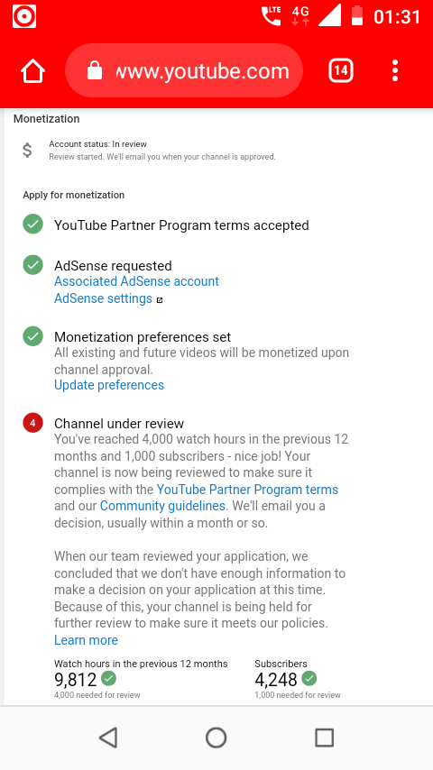 @TeamYouTube Hi YouTube Team,I have completed 1000 subscribe and 4000 hours watch time, but still my channel under review last - 2month/14day,s ,I have 4248 subscriber right now.please do something as soon as possible, please check it out... Thanks..pic.twitter.com/PoQd0dEFC5