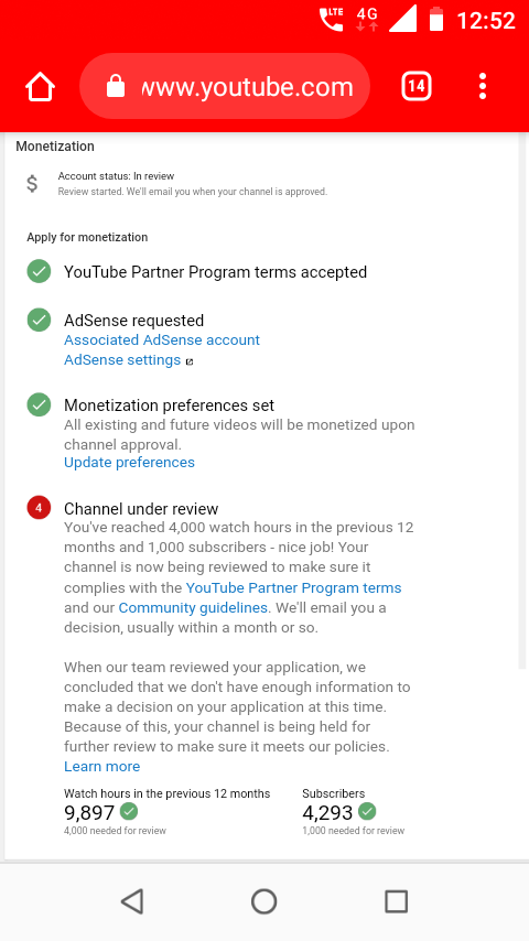 @TeamYouTube Hi YouTube Team,I have completed 1000 subscribe and 4000 hours watch time, but still my channel under review last - 2month/15day,s ,I have 4293 subscriber right now.please do something as soon as possible, please check it out... Thanks..pic.twitter.com/8kjdgpwmgC