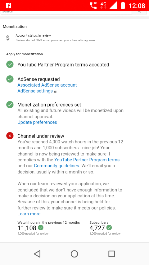@TeamYouTube Hi YouTube Team,I have completed 1000 subscribe and 4000 hours watch time, but still my channel under review last - 3month/19day,s ,I have 4727 subscriber right now.please do something as soon as possible, so how many days to enable it? please check it out... Thanks.pic.twitter.com/4rv5DcNbVQ