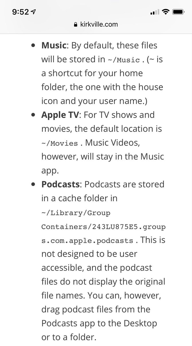 "Hey, with macOS Catalina, Apple is also cleaning up the file paths where music, movies, and podcasts are stored" *clicks link* Ah yes, music in ~/Music, movies in ~/Movies, and podcasts in ~/Library/Group Containers/243LU875E5.groups.com.apple.podcasts https://www.kirkville.com/locations-of-media-files-in-macos-catalina/ …pic.twitter.com/Lt9cVfd0Mv