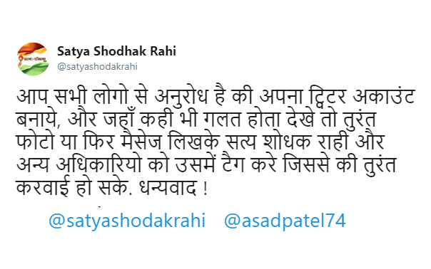 आप सभी लोगो से अनुरोध है की अपना ट्विटर अकाउंट बनाये, और जहाँ कही भी गलत होता देखे तो तुरंत फोटो या फिर मैसेज लिखके सत्य शोधक राही और अन्य अधिकारियो को उसमें टैग करे जिससे की तुरंत करवाई हो सके. धन्यवाद !