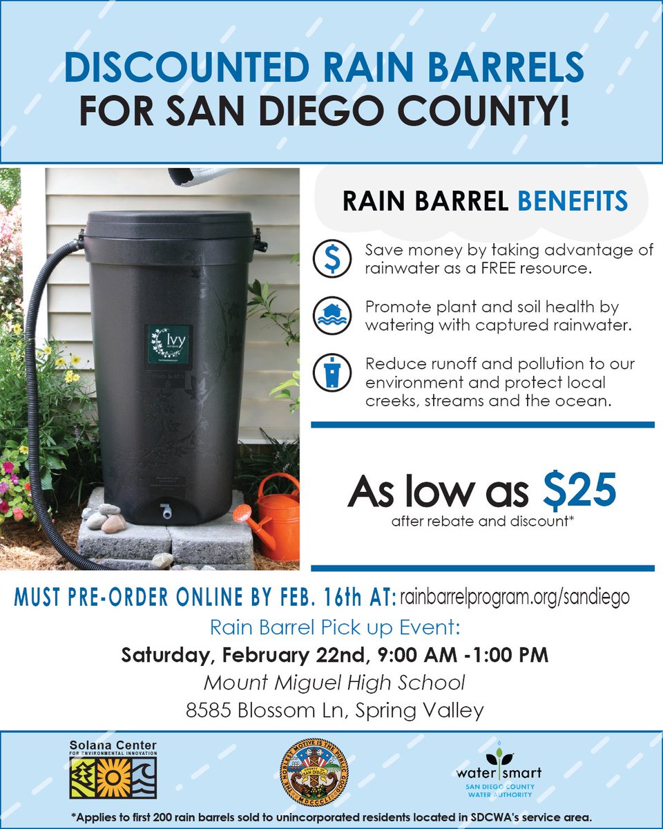 Catch the rain and water savings! Preorder your rain barrel and receive a $35 rebate. Visit the pick-up event at Mt Miguel High School on Feb 22 to receive your barrel. Learn more: http://bit.ly/2Rnsgyl