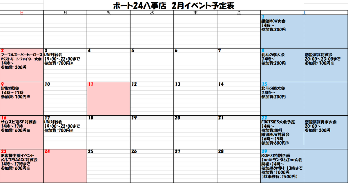 【イベント情報】 2月のイベント表(仮)になります。 HiFightさん制作のFOOTSIES大会やりますので、八事1の足払い戦うまおを決めましょう! 他にもマブスト大会やKOF11の大会などもあります。北斗の拳は世紀末武闘会の影響でいつもと日程が違いますのでご注意を。ご来店お待ちしておりますpic.twitter.com/MvPm944vqB