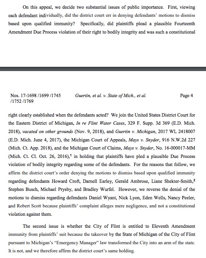 6th Circuit today ruled today that a lawsuit over the Flint water crisis against various public officials/employees could go forward: "...plaintiffs have pled a plausible Due Process violation of bodily integrity regarding some of the defendants." http://www.opn.ca6.uscourts.gov/opinions.pdf/19a0003p-06.pdf …pic.twitter.com/eVNZJETA5g
