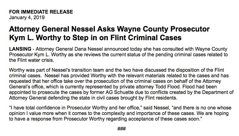 @PAKymWorthy hasn't accepted this appointment yet. Flood's contract will be canceled if Worthy takes "We are hoping to have a response from Prosecutor Worthy regarding acceptance of these cases soon," Nessel said in a statement.https://twitter.com/ChadLivengood/status/1081267693414739968 …