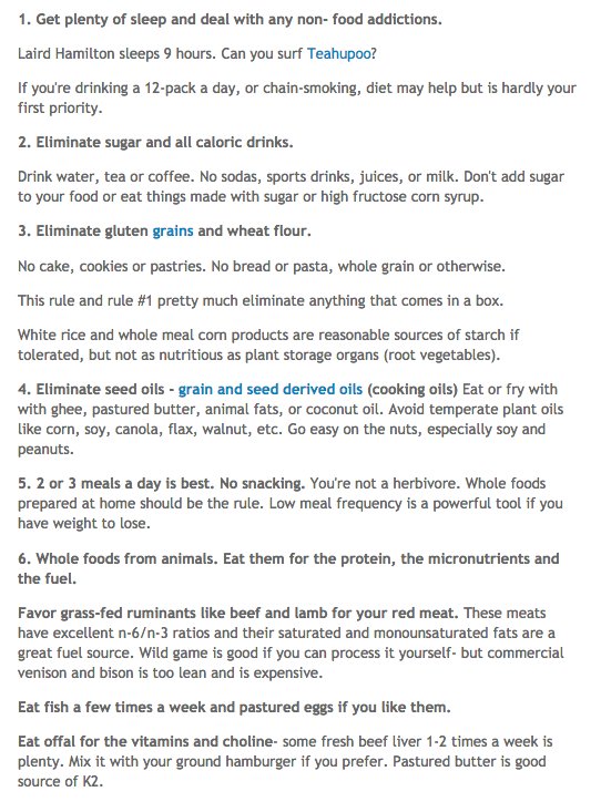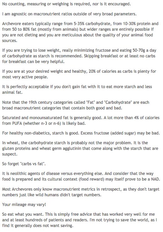 5. I think the ARCHEVORE diet is generally excellent, but for some reason the doctor who came up with it is no longer online. You can find the 12-step program here or if you googoo search, there's no marketing involved, he just gives good advice http://50kzone.blogspot.com/2011/09/archevore-diet-version-30-20-revisited.html …