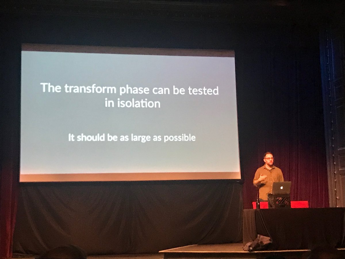 Transformation phase can be played with and tested in isolation (and should therefore be large as possible). It’s what gives rise to REPL-driven development — @ztellman #clojuresyncpic.twitter.com/vreYikVJXD