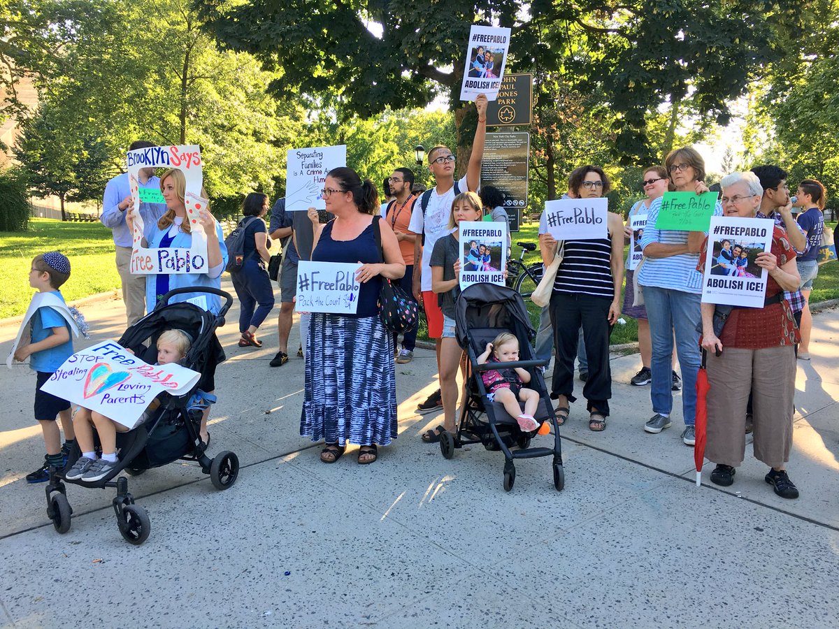 Here outside Fort Hamilton Army Base in Brooklyn as people gather to demand the freedom of Pablo Villavicencio, a pizza delivery man who is also undocumented who had ICE called on him by the army base after delivering a pizza to them. Cops here watching. #FreePablo #AbolishICE pic.twitter.com/edfbhFWSxX