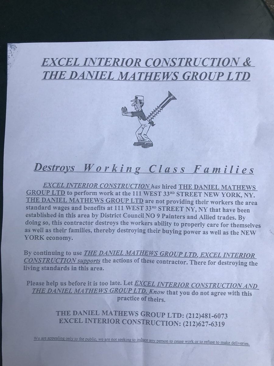 Support this important workers action against the The Daniel Matthews Group Ltd who are gouging their employees and lowering the bar for the rest! Workers are standing in front of 111 west 33rd street right now!! @nycDSA @SalazarSenate18 @nycstrike pic.twitter.com/TRjiZviJNR