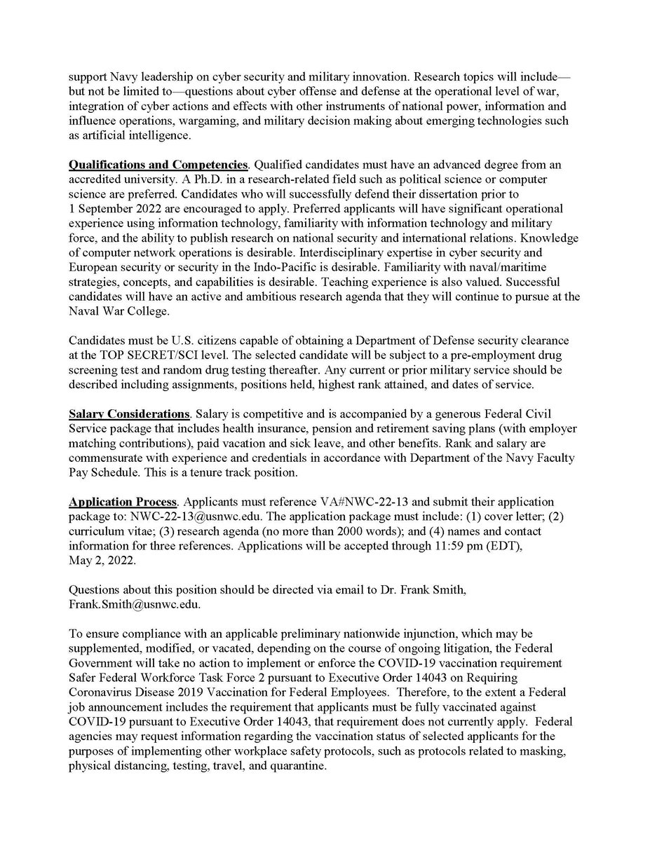 We just created a new #AssistantProfessor position! Yes, the academic job market is usually in fall. But we’re too excited to wait! And the work is too important. Get on the tenure track w/ a great team: Apply now!#nationalsecurity#cybersecurity@NavalWarCollegepic.twitter.com/YtWflofaSM